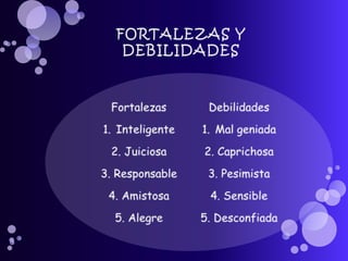 El documento presenta el proyecto de vida de Alejandra Cuervo, describiendo sus fortalezas y debilidades, su autobiografía incluyendo personas e hitos influyentes, y sus sueños y metas de convertirlos en realidad a través de la educación y el esfuerzo.