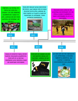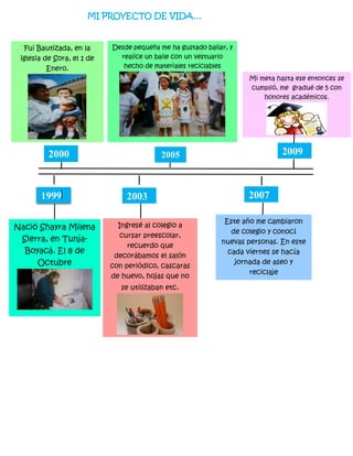 El documento describe los hitos más importantes en la vida de Shayra Milena Sierra desde su nacimiento en 1999 hasta sus metas para 2035. Incluye detalles sobre su educación, logros académicos, y enfoque en proyectos relacionados con el medio ambiente y el reciclaje. Su meta principal es graduarse como ingeniera ambiental en 2016 y trabajar para ayudar al país mediante la creación y ejecución de proyectos ambientales.
