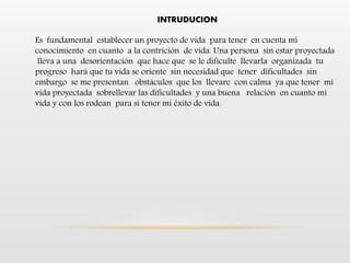 Este documento presenta el proyecto de vida de una persona. Describe sus fortalezas como ser responsable y adquirir conocimiento fácilmente, así como sus debilidades como ser impaciente. Establece objetivos como graduarse de la universidad y ser un profesor exitoso. También presenta sus valores, sueños, miedos y metas a corto, mediano y largo plazo para tener una vida plena y ayudar a su familia. Concluye que administrar bien el tiempo y proyectarse hacia el futuro permitirá alcanzar sus metas de manera exitosa