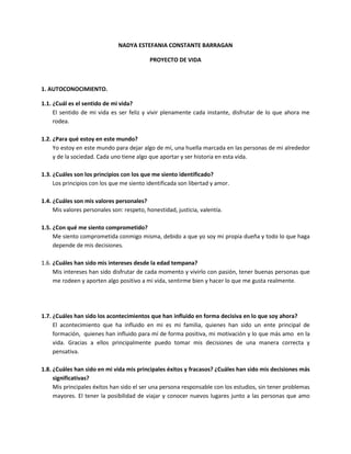 Este documento presenta el proyecto de vida de Nadya Estefanía Constante Barragán. Incluye una sección de autodescubrimiento donde explora sus valores, intereses e influencias. Su misión es dejar una huella positiva y disfrutar cada momento. Sus sueños incluyen viajar, tener una familia y empresa propia. Presenta objetivos y metas a corto y mediano plazo que incluyen graduarse, hablar otros idiomas y realizar pasantías internacionales. Concluye comprometiéndose a cumplir sus metas y de