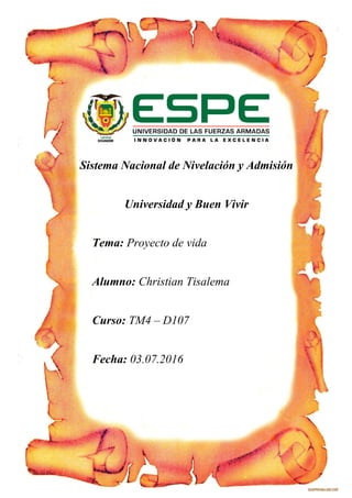 Christian presenta su plan de vida, que incluye obtener un título universitario en biotecnología para cumplir sus sueños de viajar por el mundo y conocer diferentes culturas. Analiza sus fortalezas como ser calculador y optimista, así como oportunidades como el apoyo de su familia y universidad, frente a debilidades como ser holgazán y amenazas como falta de recursos. Su misión es no darse por vencido ante los obstáculos para lograr su visión de estudiar en el extranjero y alcanzar la felicidad.