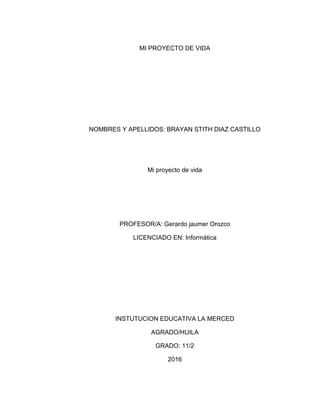 Brayan Stith Diaz Castillo es un estudiante de 17 años que cursa el grado 11. Su proyecto de vida incluye convertirse en un exitoso ingeniero civil y dueño de una constructora para el año 2025. Brayan se describe a sí mismo como una persona responsable, trabajadora y comprometida con sus estudios. Su misión es terminar su carrera universitaria para apoyar a sus padres y tener una vida acomodada.