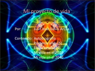 Este documento es la autobiografía de Juan José Galvis Arcila. Narra sus primeros años de vida, su etapa escolar actual en noveno grado, y sus planes y sueños para el futuro. En 2020, espera haber obtenido un título en administración de empresas internacionales y comenzar a proyectar su carrera a nivel mundial. Para 2040, planea tener una familia y un hijo a cargo de la empresa que habrá establecido, además de apoyar a sus padres en sus últimos años de vida.