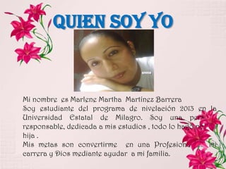 Marlene Martha Martínez Barrera es una estudiante de la Universidad Estatal de Milagro que está escribiendo su proyecto de vida. Ella es una madre soltera dedicada a sus estudios con el objetivo de convertirse en una profesional para ayudar a su familia. Su hija es su mayor fortaleza y fuente de motivación para seguir adelante a pesar de las dificultades. Su visión es obtener su título en ingeniería comercial para darle una mejor vida a su hija y ser un buen ejemplo para ella.