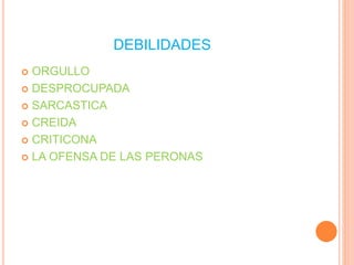 Este documento presenta una autobiografía de Xelenny Estupiñan. Detalla sus fortalezas como Dios, su familia y sinceridad, así como debilidades como el orgullo y ser sarcástica. Describe que nació en Cali pero ha vivido principalmente en Buenaventura con su madre y tres hermanos, y disfruta de actividades como leer, escuchar música y bailar, así como deportes sobre hielo.