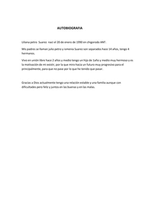 Liliana Petro Suarez es una estudiante de pedagogía infantil de 21 años que vive en Colombia. Actualmente está en una relación estable y tiene un hijo de 1 año y medio. Sus metas a corto plazo incluyen obtener un empleo para pagar sus estudios y ganar el semestre actual. A mediano plazo, quiere comprar una moto para transportarse más fácilmente. A largo plazo, desea graduarse de la universidad, trabajar como maestra para enseñar y satisfacer las necesidades de su familia.