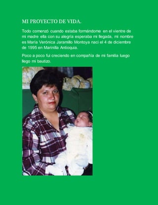 María Verónica Jaramillo Montoya nació el 4 de diciembre de 1995 en Marinilla, Antioquia, Colombia. Creció junto a su familia y disfrutó de su niñez celebrando cumpleaños con amigos y familiares, incluyendo su sobrino Sebastián y primos. Actualmente cursa el noveno grado donde ha compartido con compañeras como Astrid, Milley y Paola, y especialmente con su novio Luis Miguel. Próximamente celebrará sus quince años con la esperanza de pasarlo bien al lado de sus seres quer
