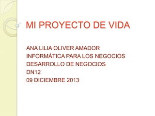 Este documento presenta el proyecto de vida de Ana Lilia Oliver Amador, estudiante de Informática para los Negocios y Desarrollo de Negocios. Su proyecto consiste en graduarse de la universidad, viajar, crear su propia empresa para convertirse en una mujer emprendedora y exitosa, y posiblemente casarse.