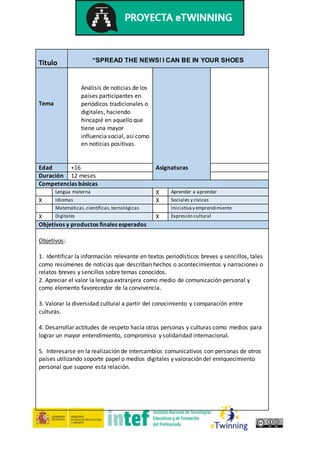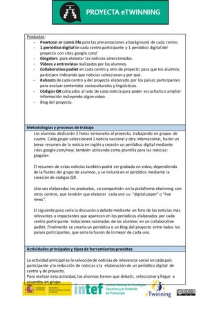 Este documento describe un proyecto de 12 meses para estudiantes mayores de 16 años que analiza noticias de países participantes. Los estudiantes trabajarán en grupos para seleccionar noticias nacionales e internacionales, resumirlas en inglés y crear periódicos digitales. Compartirán sus periódicos y debatirán las noticias más relevantes. El objetivo es que aprendan sobre otras culturas, desarrollen habilidades lingüísticas y de aprendizaje, y valoren la diversidad y comunicación internacional.