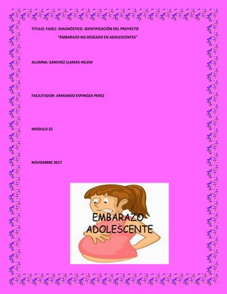 Este documento presenta el diagnóstico inicial de un proyecto sobre embarazos no deseados en adolescentes. Identifica que los embarazos precoces son un problema social significativo en México que requiere solución. Propone abordar el tema mediante charlas educativas sobre sexualidad dirigidas a adolescentes y sus familias en escuelas y comunidades, con el fin de mejorar la toma de decisiones y reducir los embarazos no planificados.