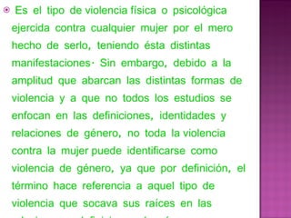 Este documento define la violencia de género como la violencia física o psicológica ejercida contra las mujeres por el hecho de serlo. Explica que existen diferentes tipos de violencia de género, incluyendo la física, psicológica y sexual. También discute mitos comunes sobre la violencia de género y describe el ciclo de violencia física que incluye acumulación de tensión, estallido de la tensión y arrepentimiento. El documento concluye explicando que el tratamiento para las ví