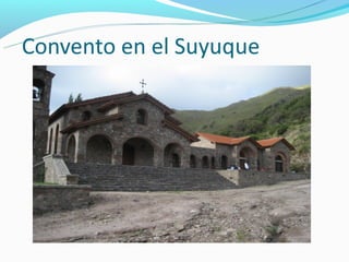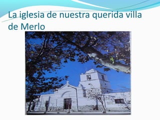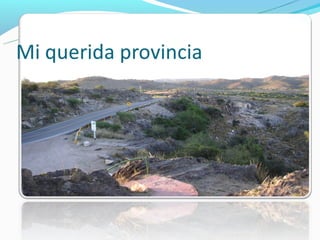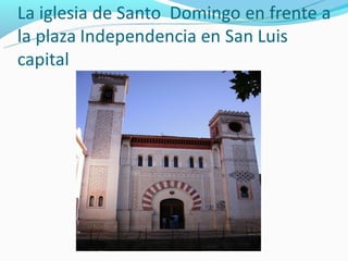 Este documento presenta varios lugares históricos y atractivos turísticos de la provincia de San Luis, Argentina. Incluye el Castillo donde la población se resguardaba de ataques aborígenes, la Plaza en Villa Mercedes, la Estación de Trenes en San Luis, el Monumento al General Manuel Belgrano, la Casa de Doña Dora Ochoa de Masramon, el Parque recreativo en Merlo, las Sierras de San Luis y Las Quijadas que tienen millones de años, las Pizarras de Bajo de Veliz que albergaron la araña