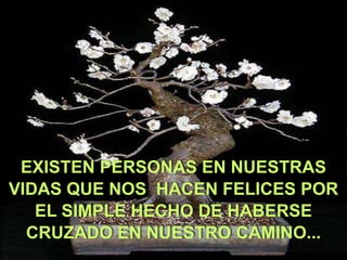 Este documento describe las diferentes clases de amigos que existen en nuestras vidas a través de la metáfora de un árbol. Compara a los amigos con las hojas de un árbol, incluyendo amigos de la familia como padres y hermanos, amigos cercanos del alma, amigos temporales y amigos distantes. Resalta que cada persona que cruza nuestro camino deja una huella y nos enseña algo sobre la vida.