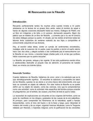 El documento trata sobre el reencuentro del autor con la filosofía. Explica que de niño observaba a su padre leyendo libros de filosofía como los Diálogos de Platón. Ahora, al escribir este ensayo, siente nostalgia por su padre fallecido pero alegría por reencontrarse con la filosofía. Luego describe brevemente el origen de la filosofía en la Grecia antigua y algunos de los primeros filósofos como Tales de Mileto. Concluye que la filosofía es el cam