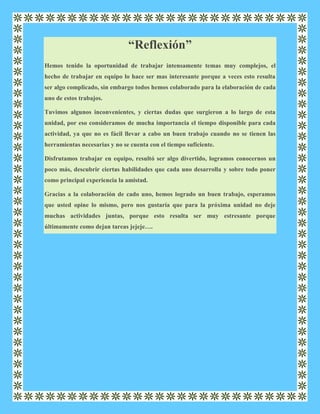 Este documento reflexiona sobre el trabajo en equipo realizado para completar varias tareas complejas. Mientras el trabajo en grupo resultó interesante, también trajo algunos inconvenientes e incertidumbres. A pesar de los desafíos, el equipo colaboró efectivamente y disfrutó conocerse mejor a través del proceso.