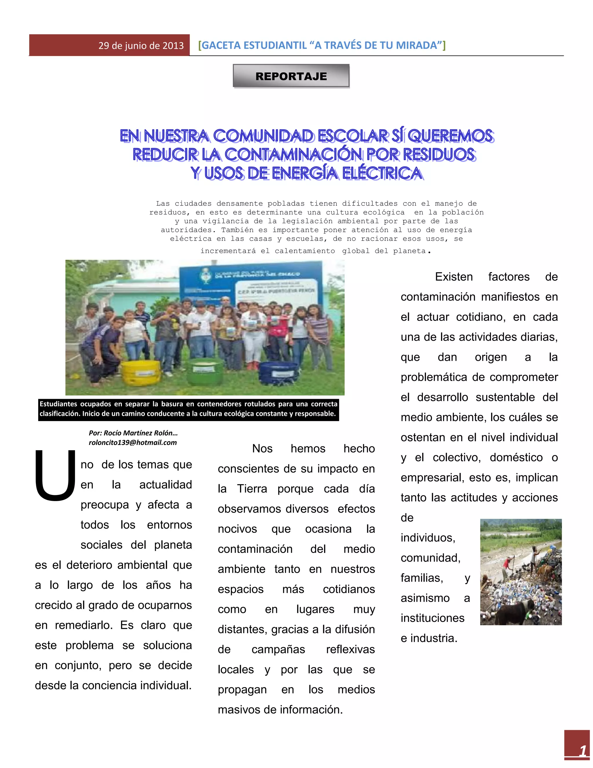 Este documento discute la contaminación ambiental y la necesidad de adoptar hábitos más sostenibles. En particular, señala que la basura y el desperdicio de energía eléctrica son problemas graves que requieren acciones a nivel individual y colectivo, como separar la basura, usar bombillas ahorradoras de energía, y apagar dispositivos eléctricos cuando no se usan. El documento también resalta la importancia de promover una cultura de reciclaje, reducción y reutilización entre los estudiantes y la comunidad escolar para crear un