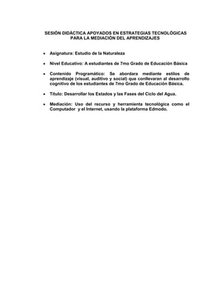 Este documento presenta una sesión didáctica apoyada en estrategias tecnológicas para estudiantes de 7mo grado sobre los estados y fases del ciclo del agua. La sesión utilizará la plataforma educativa Edmodo para que los estudiantes exploren el tema, comenten y envíen resúmenes con sus propias ideas. La sesión busca que los estudiantes construyan su propio aprendizaje sobre este tema relevante considerando la temporada de lluvias en Venezuela.