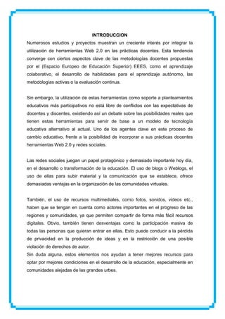 Las herramientas de la Web 2.0 como blogs, wikis, redes sociales y contenido compartido están ganando importancia en la educación al permitir el aprendizaje colaborativo, el desarrollo de habilidades de aprendizaje autónomo y metodologías activas. Sin embargo, su uso plantea conflictos con las expectativas de docentes y estudiantes sobre privacidad y derechos de autor. Estas herramientas pueden usarse para apoyar la educación a distancia y mejorar el acceso en comunidades alejadas de las grandes ciud