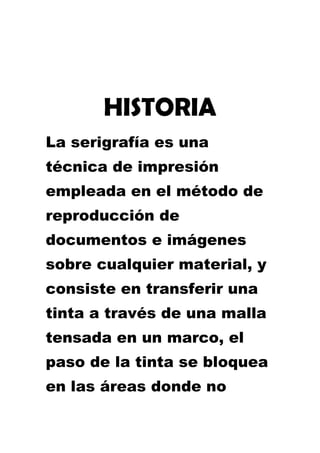Este documento describe el proceso de serigrafía. Explica que primero se debe obtener un soporte textil adecuado como muselina o seda sintética dependiendo de la resolución deseada. Luego, el soporte se tensa en un bastidor de madera o marco metálico para quedar sin arrugas pero sin rasgarse durante la impresión. Finalmente, se templa el soporte en el bastidor listo para comenzar la impresión serigráfica.