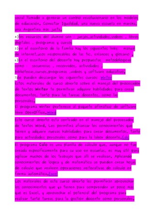 Este documento describe el Programa Conectar Igualdad en Argentina, una política de inclusión digital lanzada en 2010 que distribuyó netbooks a estudiantes y docentes de escuelas secundarias públicas. El programa busca promover el uso de la tecnología en las aulas y hogares para transformar los modelos de educación. Los estudiantes y docentes reciben recursos digitales como juegos, videos y software educativo en sus netbooks.