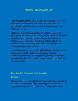 Este manual describe cómo usar el robot educativo LEGO Mindstorms NXT. Incluye instrucciones para construir y programar robots utilizando ladrillos NXT, sensores y motores. Explica cómo conectar los componentes al ladrillo central NXT y descargar programas utilizando Bluetooth o un cable USB.