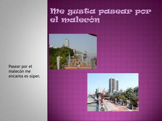 El documento describe varias actividades y cosas que le gustan a la persona como pasear por el malecón, viajar a Salinas, cantar, bailar ballet, jugar básquetbol y fútbol, amar la vida, ser feliz y pasarla en familia.