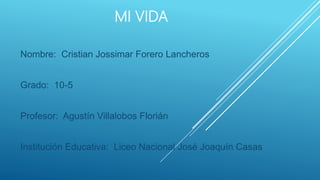 Cristian Jossimar Forero Lancheros nació en 2003 en Chiquinquirá, Boyacá. Actualmente cursa el grado 10 en el Liceo Nacional José Joaquín Casas. Le gusta jugar videojuegos, deportes como el fútbol, y usar la computadora. Su asignatura favorita es informática y planea estudiar ingeniería de sistemas en la universidad para ayudar a su familia en el futuro.