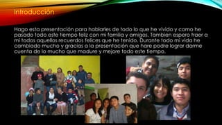 El documento habla sobre la vida del autor. Describe su familia, incluyendo sus padres, hermano, primos y abuelos. También describe sus experiencias en la escuela primaria, secundaria y preparatoria, incluyendo a sus amigos. Finalmente, describe su vida social y sus amigos actuales en el equipo de baloncesto.