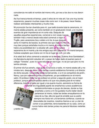 Este documento describe la vida de Chunqui Lara, Cecilia Isamar desde su nacimiento en Cajamarca, Perú hasta sus experiencias actuales como catequista. Creció en una familia humilde con su madre y tío. Asistió a la escuela primaria donde disfrutó participar en actuaciones. Más tarde asistió al colegio Juan XXIII y se involucró en la iglesia parroquial de San Sebastián donde ahora es catequista.