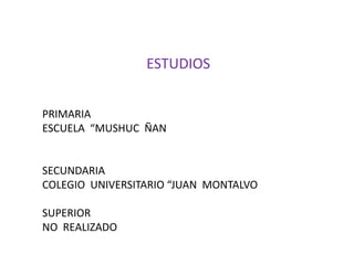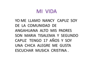 Nancy Capuz es una chica de 17 años de la comunidad de Angahuana Alto. Estudió primaria en la Escuela "Mushuc Ñan" y secundaria en el Colegio Universitario "Juan Montalvo", aunque no ha realizado estudios superiores. En su mensaje a los jóvenes les aconseja pensar bien las cosas antes de actuar y darse cuenta de la importancia de los estudios, que son una herencia valiosa que los padres pueden brindar.