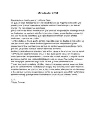 La autora le cuenta a Xavier Soria sobre su exitosa vida en el 2034, en la que ha viajado por el mundo como diseñadora y ha pagado las deudas de sus padres. Aunque no se ha casado ni tenido hijos, se siente contenta y apoyada por sus seres queridos.