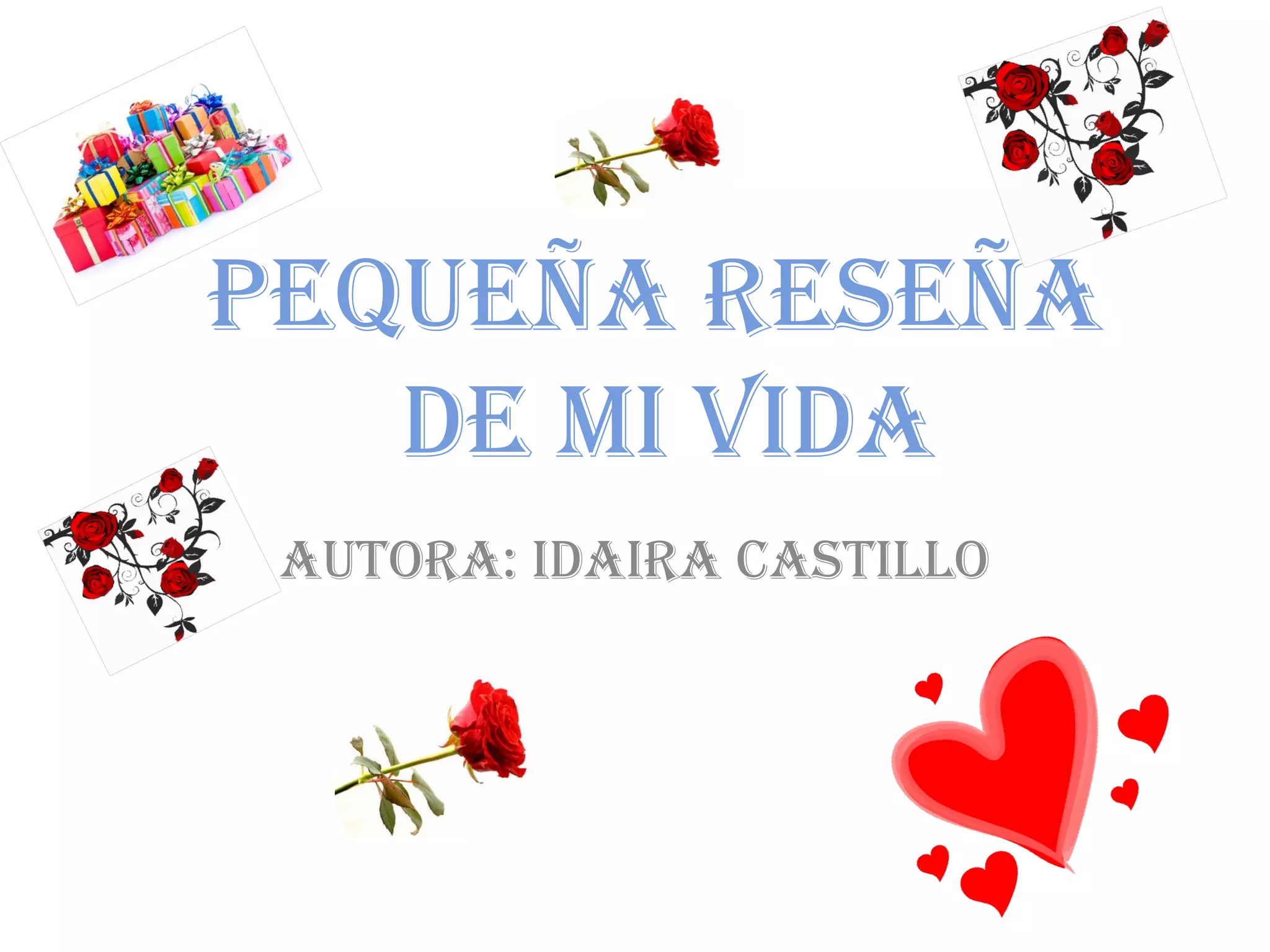 Este documento presenta una breve reseña de la vida de Idaira Castillo a través de una serie de fotos. Comienza presentando a sus padres y su agradecimiento por la enseñanza moral y las buenas costumbres que le inculcaron. Luego muestra fotos de ella como bebé, en su adolescencia disfrutando de actividades como manualidades y baile, y con su hijo recién nacido, quien es su mayor tesoro. También incluye fotos de su trabajo como terapeuta ocupacional y con su hermano querido durante la Navidad