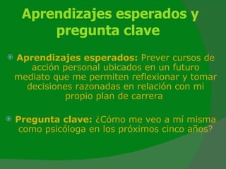 Este documento presenta los planes futuros de la autora como psicóloga en los próximos 5 años. Sus metas a corto plazo incluyen titularse realizando una tesis en temas como el bullying, la motivación escolar o la evaluación educativa. Sus metas a mediano y largo plazo incluyen trabajar durante 3 años y luego realizar una maestría en evaluación educativa. Sus intereses profesionales se centran en la capacitación docente y mejorar la calidad de la educación mediante el apoyo a los profesores.