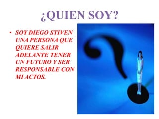 Este documento presenta el proyecto de vida de Diego Stiven Agudelo Cano, un estudiante de 11vo grado que aspira a tener un futuro responsable y salir adelante a través de sus estudios. Diego se ve a sí mismo como una persona que vence los obstáculos para alcanzar sus objetivos y desea ser visto por otros como alguien de confianza, amable y responsable.