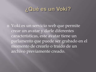 Voki es un servicio web que permite crear un avatar animado con voz. Los usuarios pueden personalizar la apariencia del avatar seleccionando la cara, ropa y accesorios, y agregar un audio grabado o de texto. Una vez creado, el avatar animado con voz se puede publicar en blogs u otros sitios web.