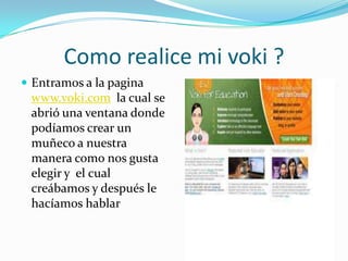 Los estudiantes describen el proceso de crear un avatar digital llamado Voki usando el sitio web voki.com. Primero eligen un muñeco y lo personalizan con ropa y accesorios. Luego escriben un mensaje y seleccionan un idioma para que el Voki hable. Finalmente crean una cuenta en el sitio y guardan su Voki para poder publicarlo y compartirlo.