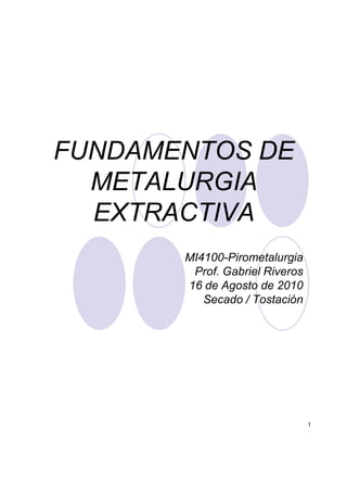 Este documento trata sobre los fundamentos de la pirometalurgia extractiva. Explica los procesos de secado y tostación de concentrados, incluyendo los tipos de secadores, las reacciones químicas involucradas en la tostación, y los diagramas de predominancia para sistemas Cu-Fe-S-O. También describe tostadores industriales de pisos y de lecho fluidizado.