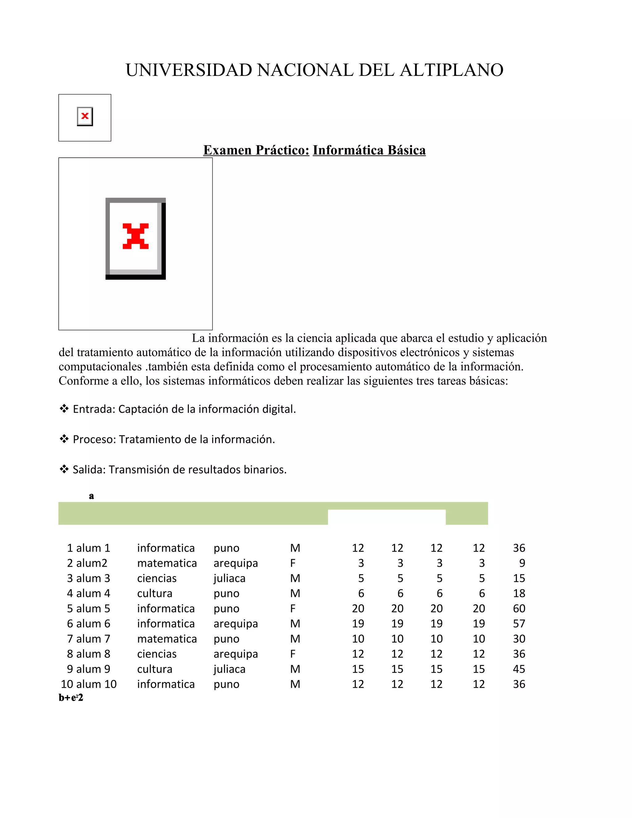 Este documento presenta un examen práctico sobre informática básica. Define la informática como la ciencia que estudia el procesamiento automático de la información utilizando dispositivos electrónicos y sistemas computacionales. Explica que los sistemas informáticos deben realizar tres tareas básicas: entrada de información digital, procesamiento de la información, y transmisión de resultados binarios. Además, incluye una tabla con los resultados de 10 alumnos de diferentes cursos.