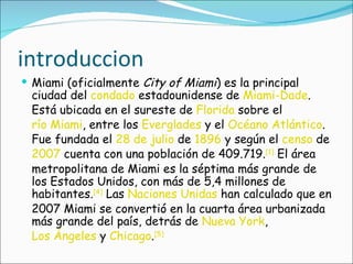 Miami es la principal ciudad del condado de Miami-Dade en el sureste de Florida. Fundada en 1896, Miami tiene una población de más de 400,000 habitantes y se encuentra ubicada entre los Everglades y el Océano Atlántico. El área metropolitana de Miami es la séptima más grande de los Estados Unidos con más de 5.4 millones de habitantes.