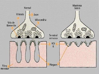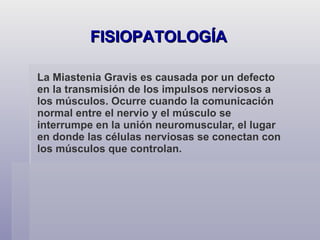 La miastenia gravis es un trastorno autoinmune caracterizado por debilidad muscular episódica causada por anticuerpos que destruyen los receptores de acetilcolina en la unión neuromuscular. Esto interrumpe la transmisión de señales nerviosas a los músculos y causa fatiga y debilidad muscular que empeora con el uso repetido de los músculos. Los síntomas iniciales suelen ser debilidad de los músculos oculares y de la cara. El tratamiento incluye fármacos anticolinesterás