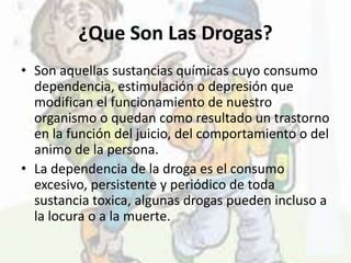Este documento resume las drogas más comunes que consumen los adolescentes y sus efectos. Explica que las drogas son sustancias químicas que modifican el funcionamiento del organismo y pueden causar dependencia física o psíquica. Las drogas duras como la cocaína y la heroína causan una fuerte adicción, mientras que las drogas blandas como la marihuana generalmente solo generan dependencia psíquica. El consumo de drogas trae consecuencias negativas como problemas de salud, bajo rendimiento y cambios de personalidad