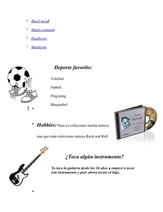 El documento proporciona ejemplos de temas sobre los que hacer un listado de intereses, como música favorita, deporte favorito, hobbies, instrumentos musicales, series de televisión y géneros cinematográficos. Luego presenta las listas de intereses de alguien en particular sobre esos temas, incluyendo sus géneros musicales y deportivos favoritos, sus hobbies de coleccionar música y tocar la guitarra y el bajo, y sus series y géneros de películas preferidos.