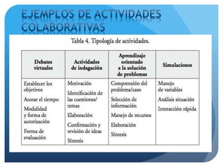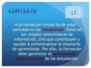 El documento argumenta que la formación virtual debe estar centrada en los estudiantes, quienes no son meros consumidores de información sino que contribuyen y ayudan a contextualizar el aprendizaje. Es importante diseñar experiencias que ofrezcan posibilidades para la colaboración entre estudiantes y que el profesorado ofrezca un seguimiento constante y apoyo. Las dificultades para lograr un proceso colaborativo se deben más al diseño deficiente de las actividades que a limitaciones técnicas.
