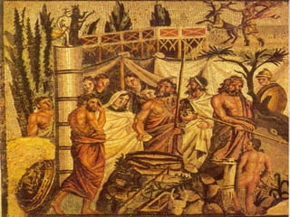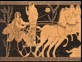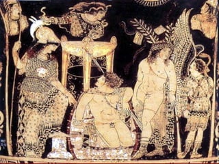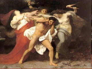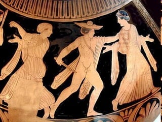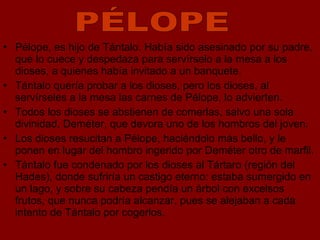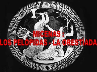 El documento resume la saga de los Pelópidas, una familia real de Micenas marcada por la maldición y el derramamiento de sangre. Pélope funda la dinastía y es padre de Hipodamia y Atreo. Atreo y su hermano Tiestes se disputan el trono, lo que genera una enemistad que desemboca en crímenes atroces como canibalismo y asesinatos. Sus hijos Agamenón y Menelao heredan la rivalidad. Agamenón es asesinado por su esposa Clitemnestra y su