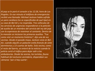 Michael Jackson sufrió un paro cardíaco en su casa en Los Ángeles. Fue trasladado en ambulancia a un hospital, donde los médicos no pudieron reanimarlo. Su muerte a los 50 años conmocionó al mundo de la música y a sus fans debido a su enorme talento musical y su estilo único, aunque también estuvo marcado por controversias y excentricidades a lo largo de su vida.