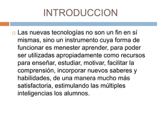 Este documento describe diferentes tecnologías educativas como las TIC, redes sociales, aulas virtuales, wikis y blogs. Explica que estas herramientas pueden usarse para enseñar de manera más satisfactoria y estimulante, facilitando la comprensión y adquisición de nuevos conocimientos. También habla sobre Internet y comunidades de contenido para compartir información de manera descentralizada.