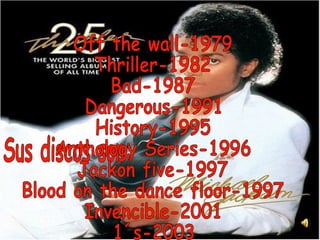 Michael Jackson fue un cantante y bailarín estadounidense conocido como el "Rey del Pop". Algunos de sus discos más exitosos fueron Thriller, Bad y Off the Wall. Nació en 1958 en Indiana y murió en 2009 en California por una sobredosis de morfina a los 50 años de edad.