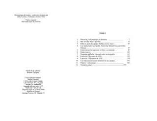 Este documento presenta un resumen de varios conceptos clave de Michel Foucault relacionados con la genealogía y el poder. En primer lugar, la genealogía requiere un enfoque meticuloso y documentado, en lugar de narrativas lineales o teleológicas. Segundo, Foucault discute el uso que hace Nietzsche de los términos "origen" y "herencia", señalando que la genealogía rechaza la búsqueda de un único origen esencial de las cosas. En tercer lugar, la genealogía muestra