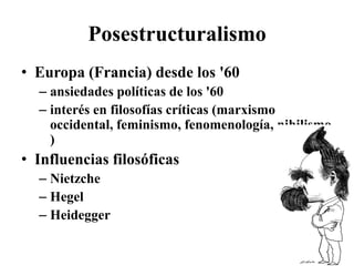 El documento explora las contribuciones de Michel Foucault al posestructuralismo y su influencia en la antropología contemporánea, destacando su crítica a las verdades absolutas y la noción del ser como constructo ficticio. A través de su obra, Foucault desafió las estructuras de poder y conocimiento, argumentando que la libertad puede encontrarse en el deseo corporal y las experiencias extremas. Sus ideas sobre el biopoder y las tecnologías del castigo han transformado la comprensión del control social en la modernidad.