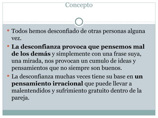 El documento habla sobre la desconfianza en las relaciones. Explica que la desconfianza provoca pensamientos negativos sobre los demás y puede llevar a malentendidos. Las personas desconfiadas tienden a contraatacar con rapidez, sospechar en exceso y distanciarse de forma hostil. También son reacias a confiar en los demás por temor a que su información sea usada en su contra. La confianza es importante en las relaciones humanas y su ausencia puede deberse a experiencias negativas previas.